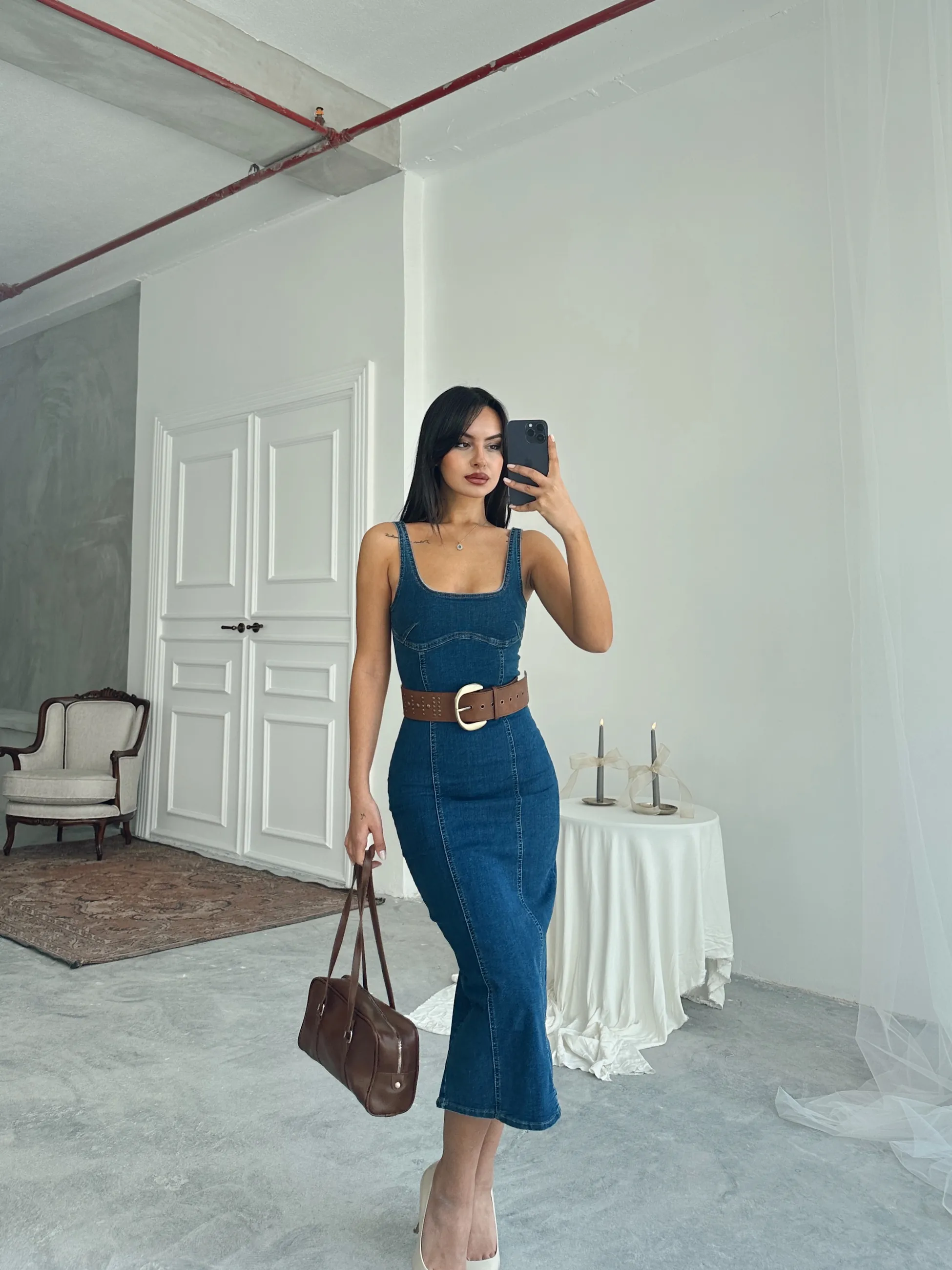 Arka Yırtmaç Midi Boy Denim Elbise - Lacivert (MD3634_Lacivert)