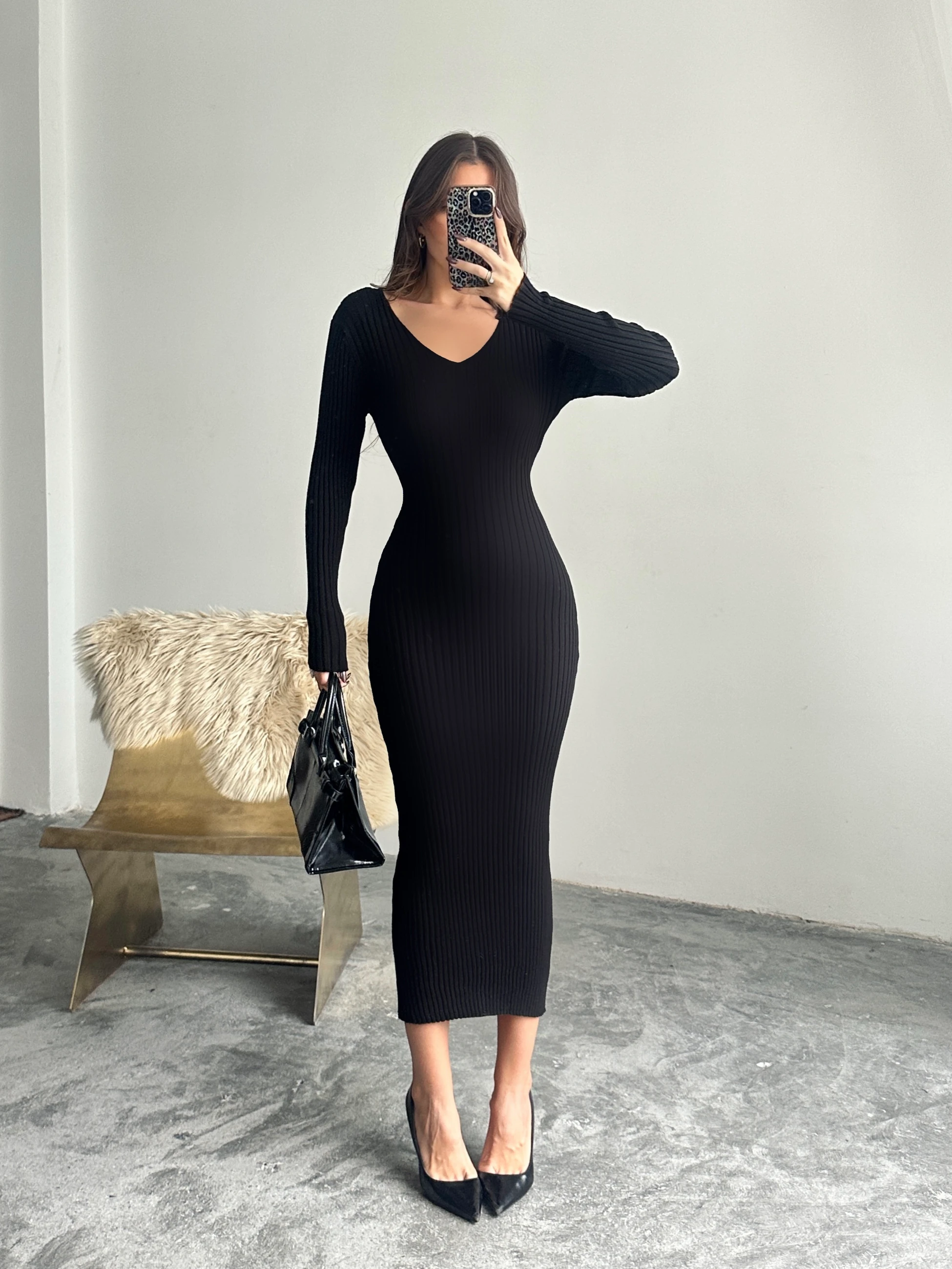 Bel Bağlama Triko Elbise - Siyah (MD4038_Siyah)