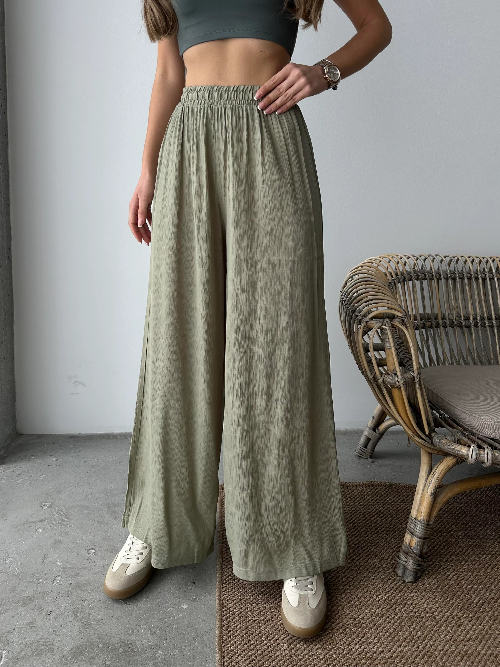 Bel Lastik Tiril Palazzo Pantolon Çimen Yeşili - Çimen Yeşili Bel Lastik Tiril Palazzo Pantolon Taba - Taba Bel Lastik Tiril Palazzo Pantolon Siyah - Siyah Bel Lastik Tiril Palazzo Pantolon Bej - Bej