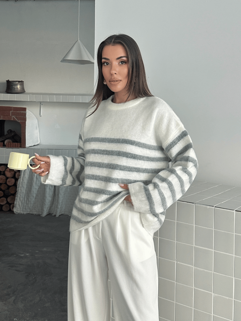 Bisiklet Yaka Çizgili Kazak - Gri (MD4039_Gri)