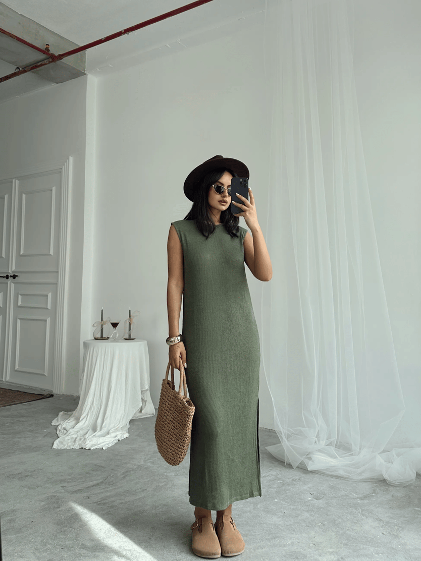 Bisiklet Yaka Sıfır Kol Elbise - Haki Yeşil (MD3657_Haki Yeşil)