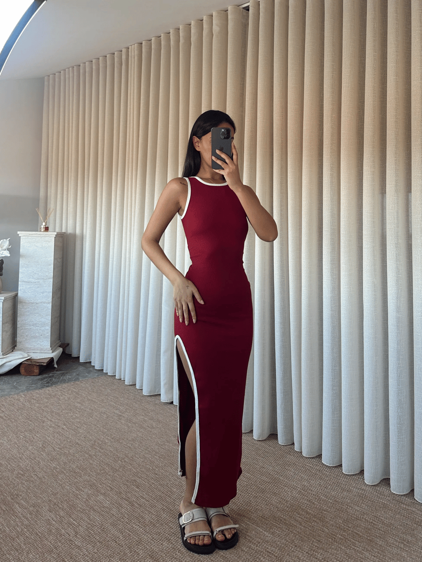 Biyeli Yan Yırtmaç Maxi Elbise - Bordo (MD3720_Bordo)