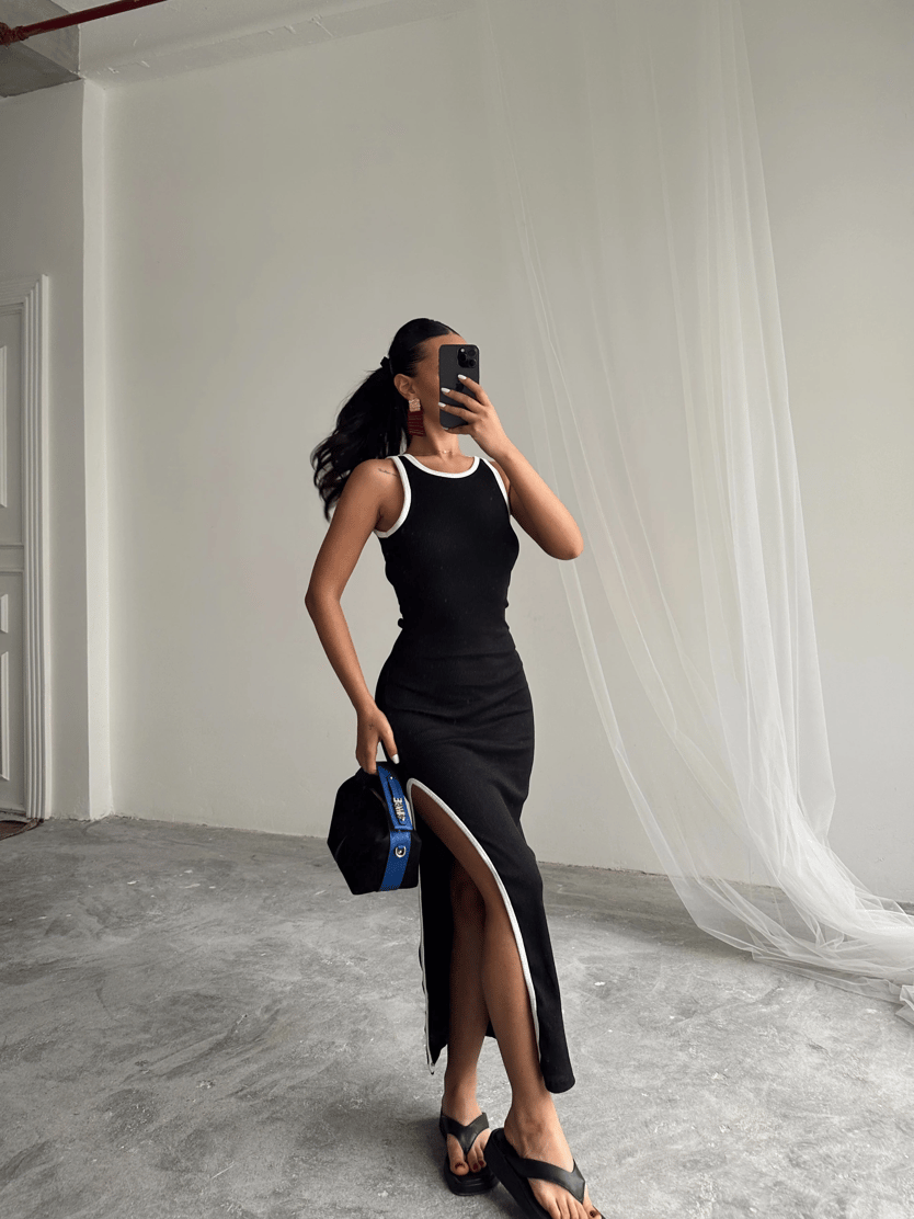 Biyeli Yan Yırtmaç Maxi Elbise - Siyah (MD3720_Siyah)