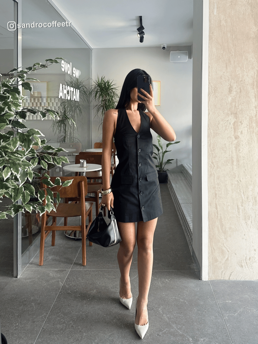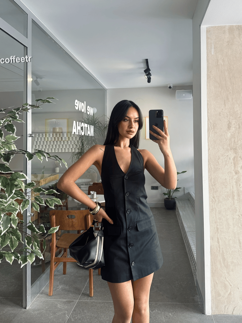 Boyundan Bağlamalı Düğmeli Mini Elbise - Siyah (MD3776_Siyah)