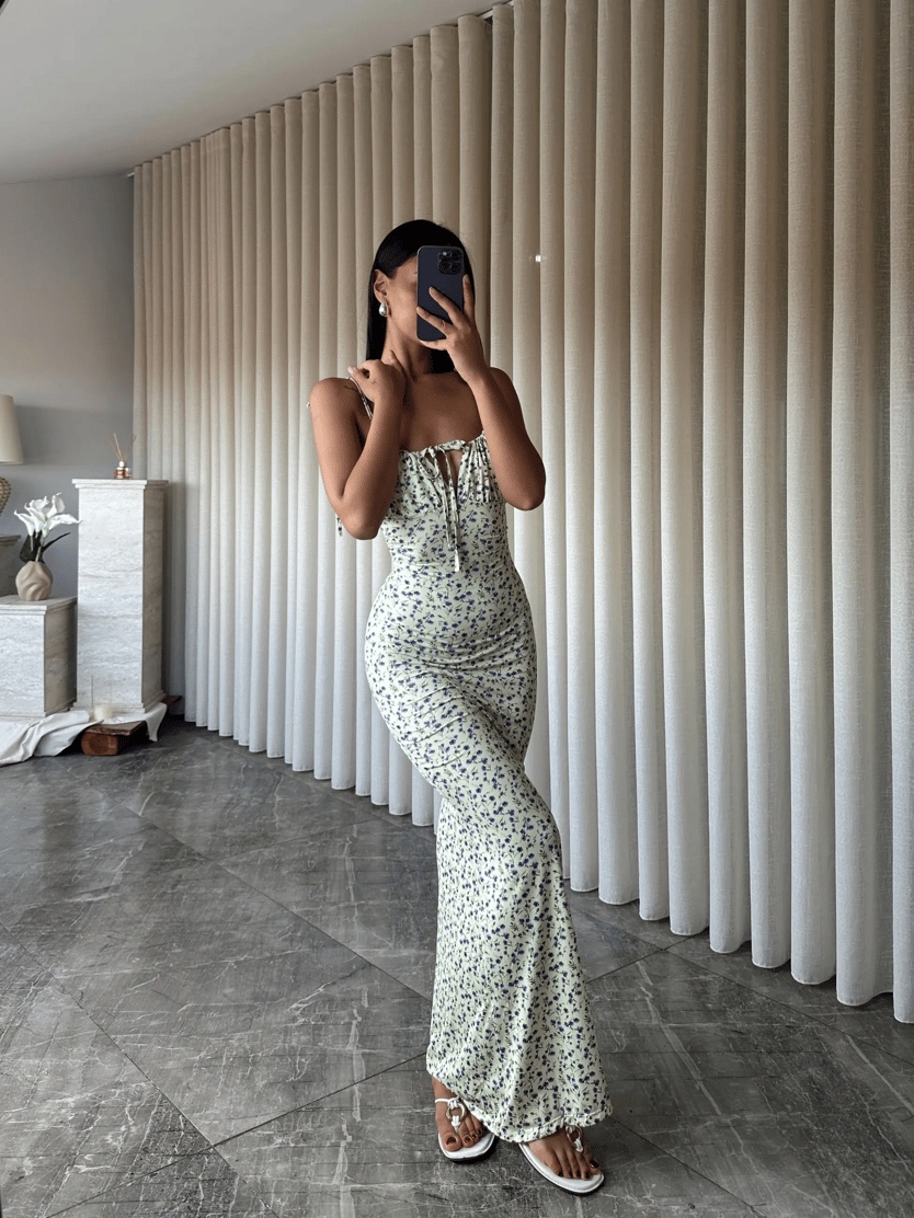 Çiçek Desen Maxi Elbise  - Bebe Mavi
