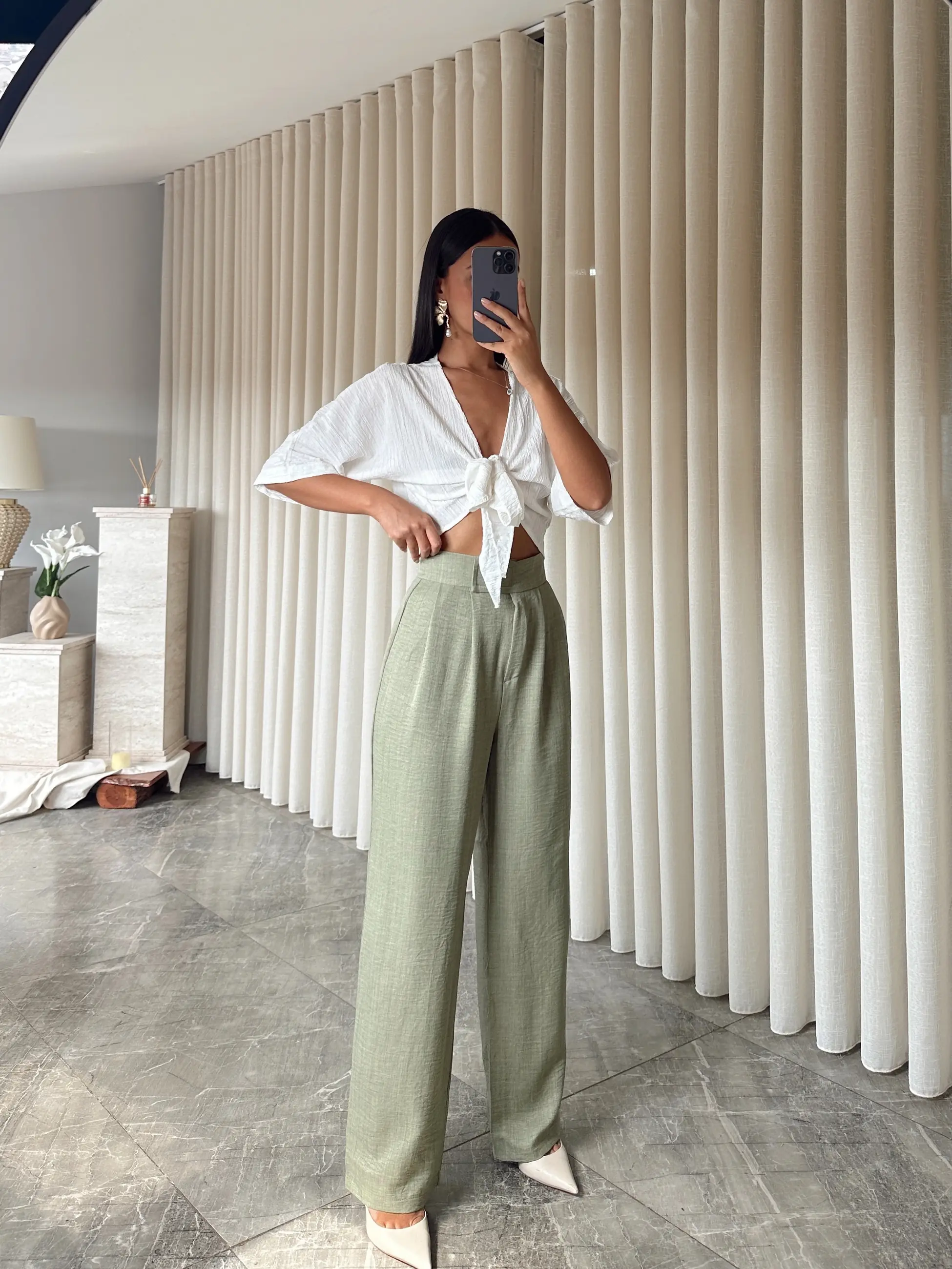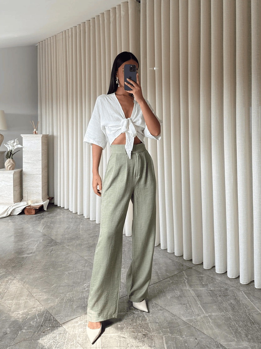 Cırtlı Keten Palazzo - Haki Yeşil (MD4005_Haki Yeşil)