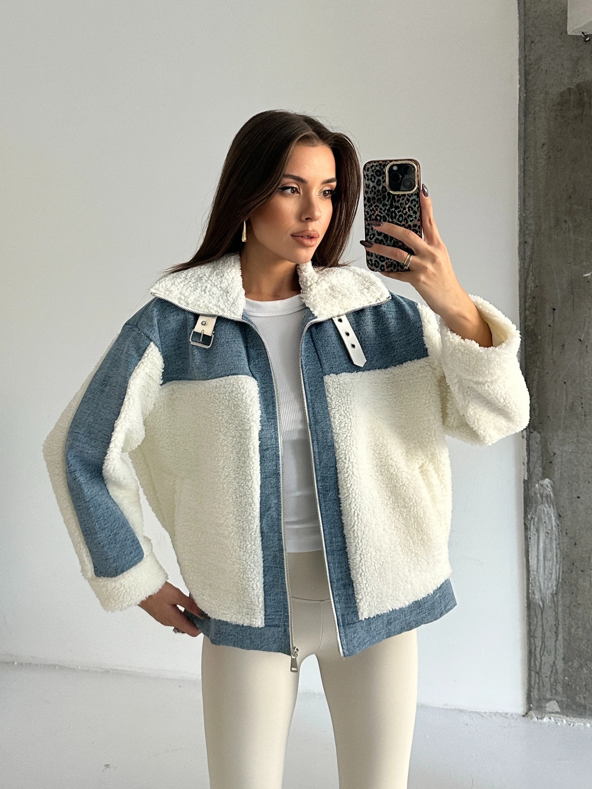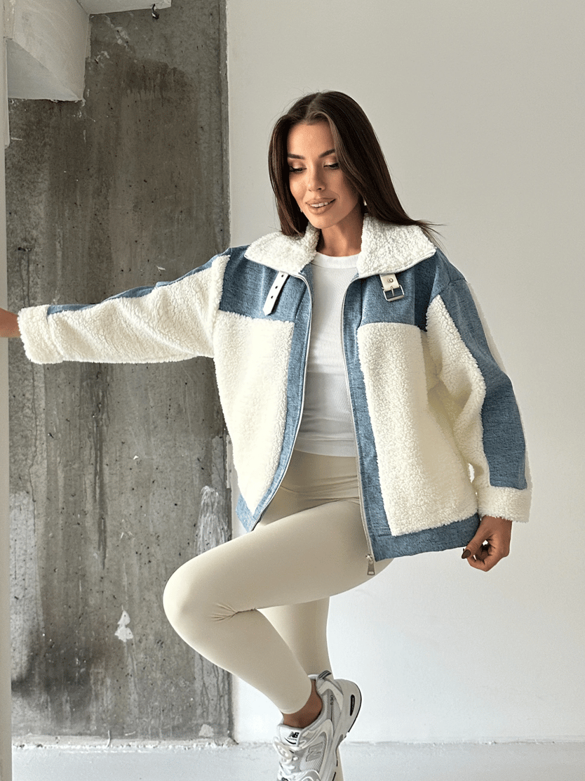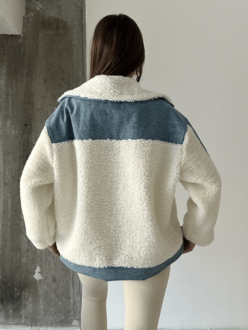 Denim Detaylı Peluş Mont - Mavi-Beyaz (MD4123_Mavi-Beyaz)