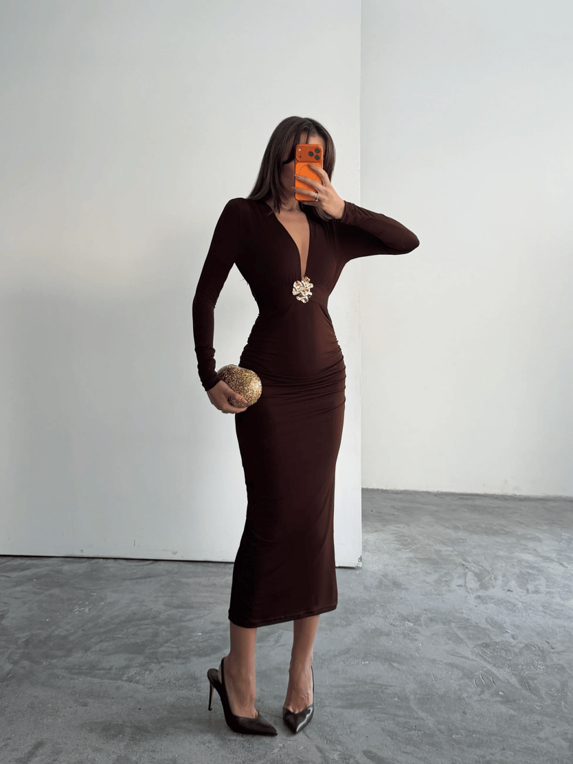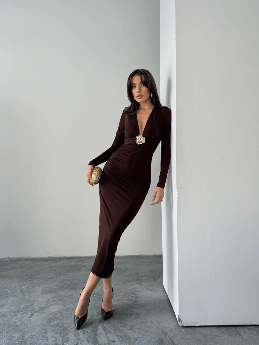 Derin V Yaka Tokalı Midi Elbise - Kahverengi (MD4187_Kahverengi)