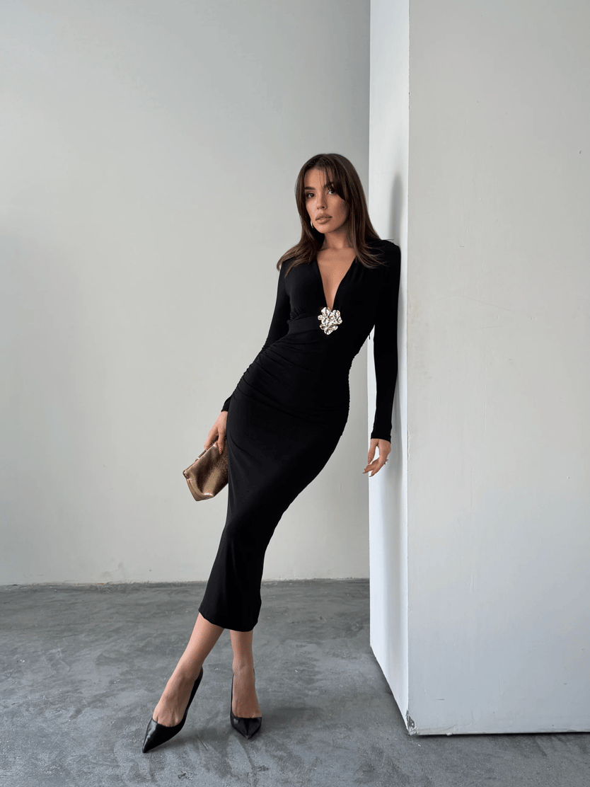 Derin V Yaka Tokalı Midi Elbise - Siyah (MD4187_Siyah)