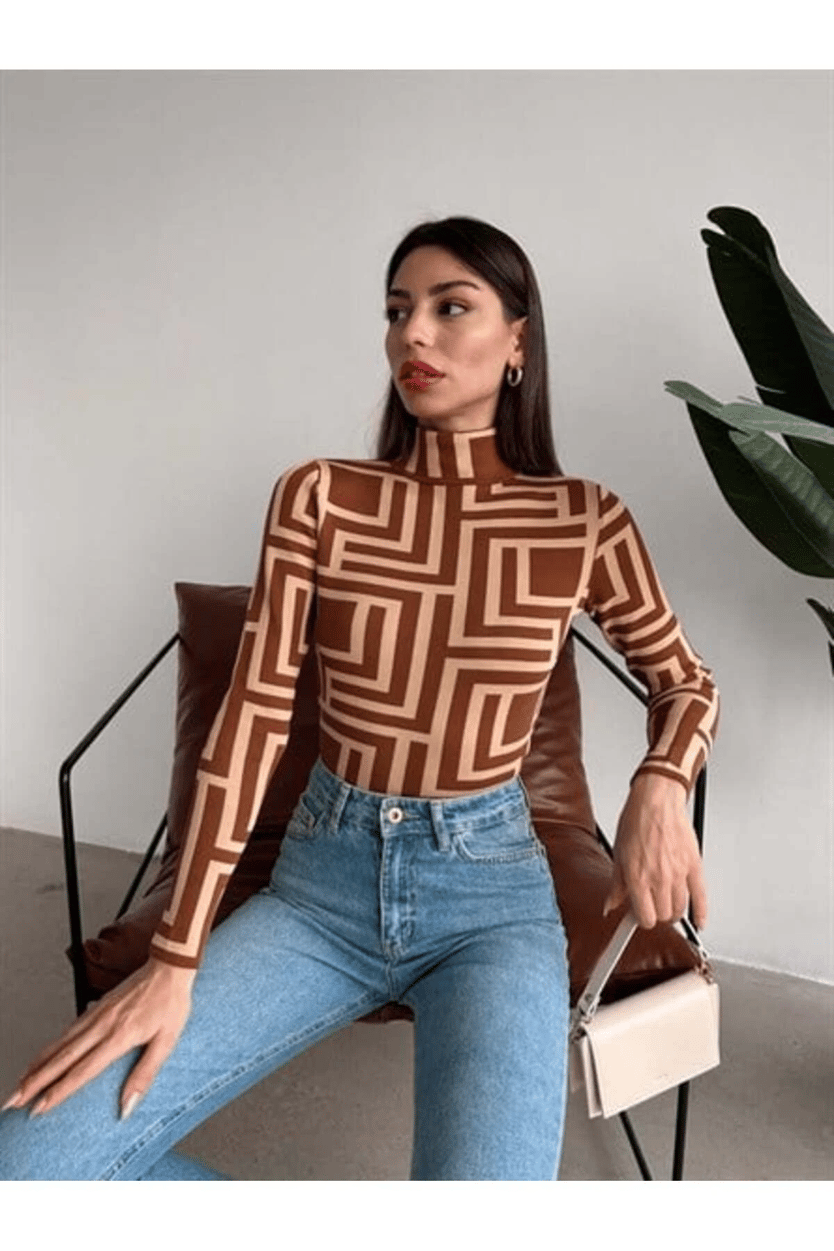 Desenli Dik Yaka Triko Bluz KİREMİT DESEN - Kiremit Desen (MYD9200.TR.01_Kiremit Desen)