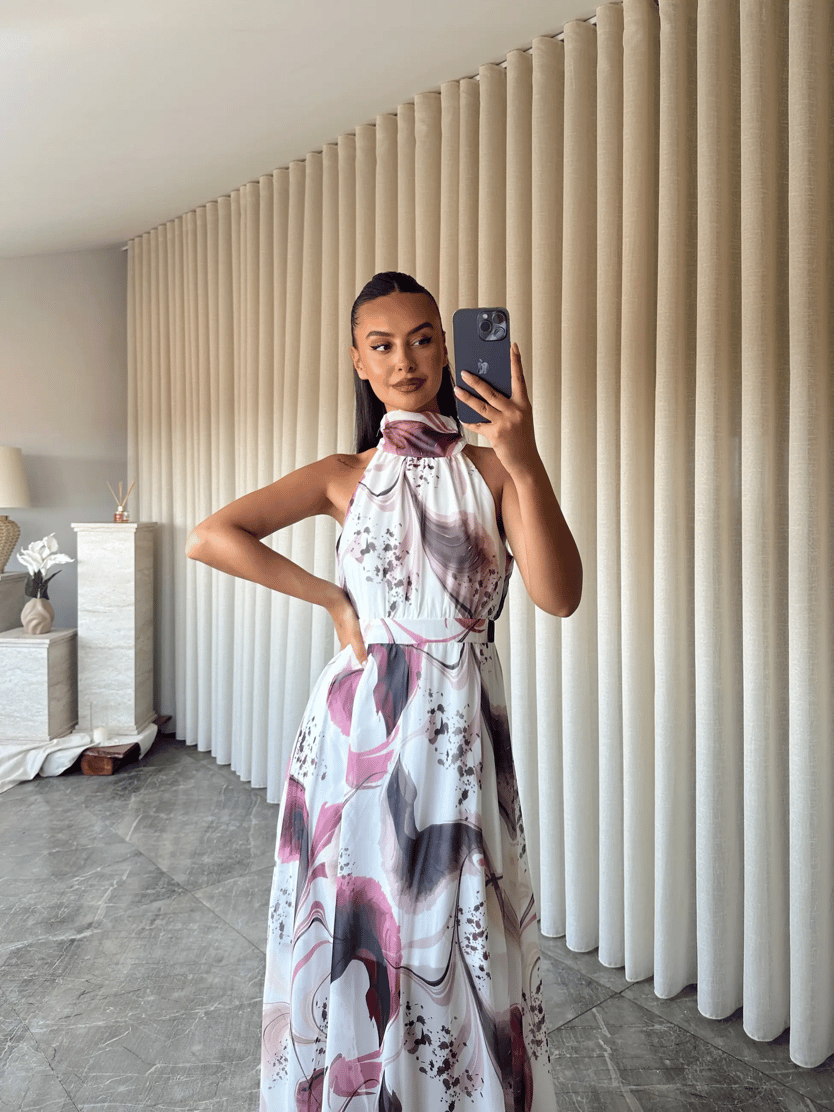 Desenli Şifon Elbise - Ekru-Pembe (MD3931_Ekru-Pembe)