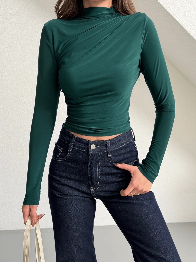 Dik Yaka Drapeli Uzun Kol Bluz - Zümrüt Yeşili (MD4321_Zümrüt Yeşili)