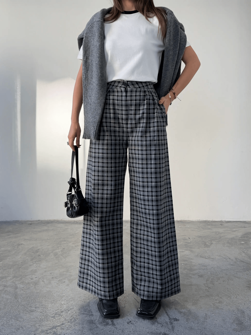 Ekose Üç Pile Palazzo Pantolon - Siyah (MYD7511_Siyah)