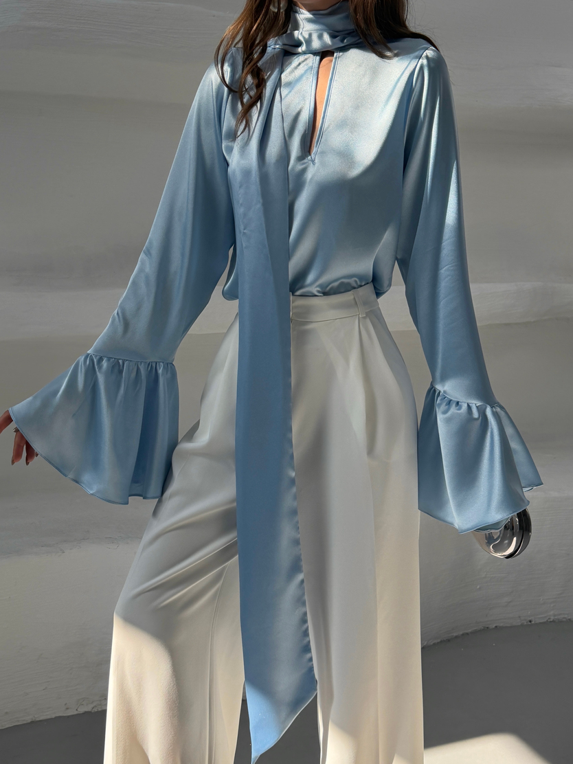 Fular Detay İspanyol Kol Saten Bluz - Bebe Mavi (MYD7518_Bebe Mavi)