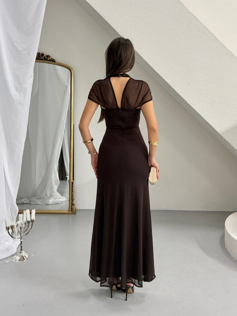 Göğüs Detaylı Maxi Tül Elbise - Kahve (MD4369_Kahve)