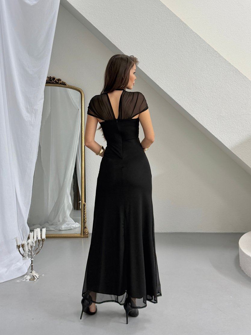 Göğüs Detaylı Maxi Tül Elbise - Siyah (MD4369_Siyah)