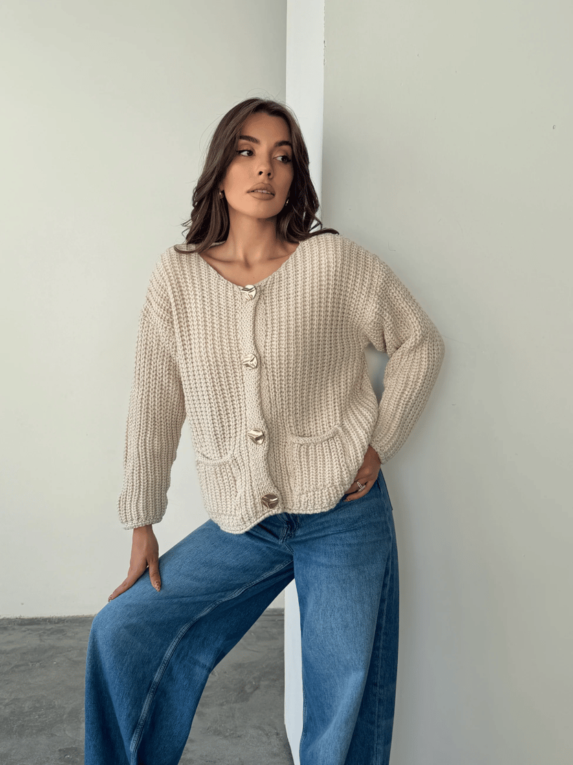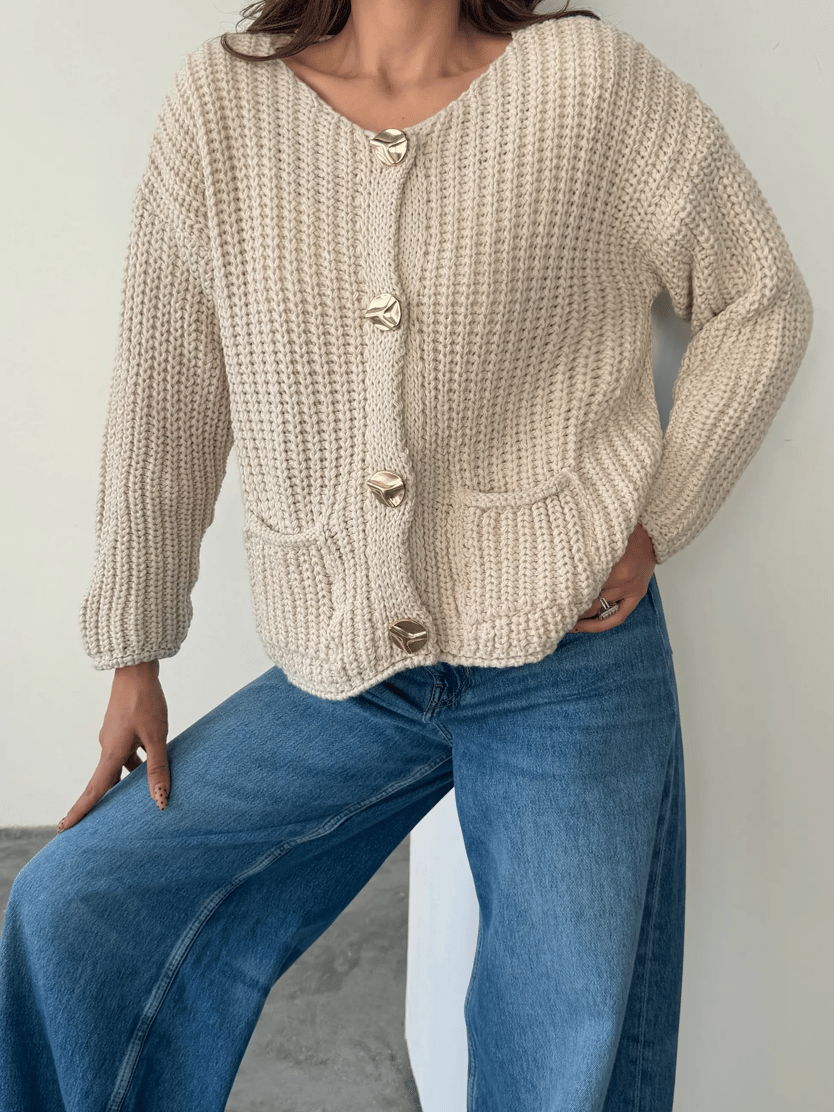 Gold Düğmeli Örme Hırka - Taş (MD4190_Taş)