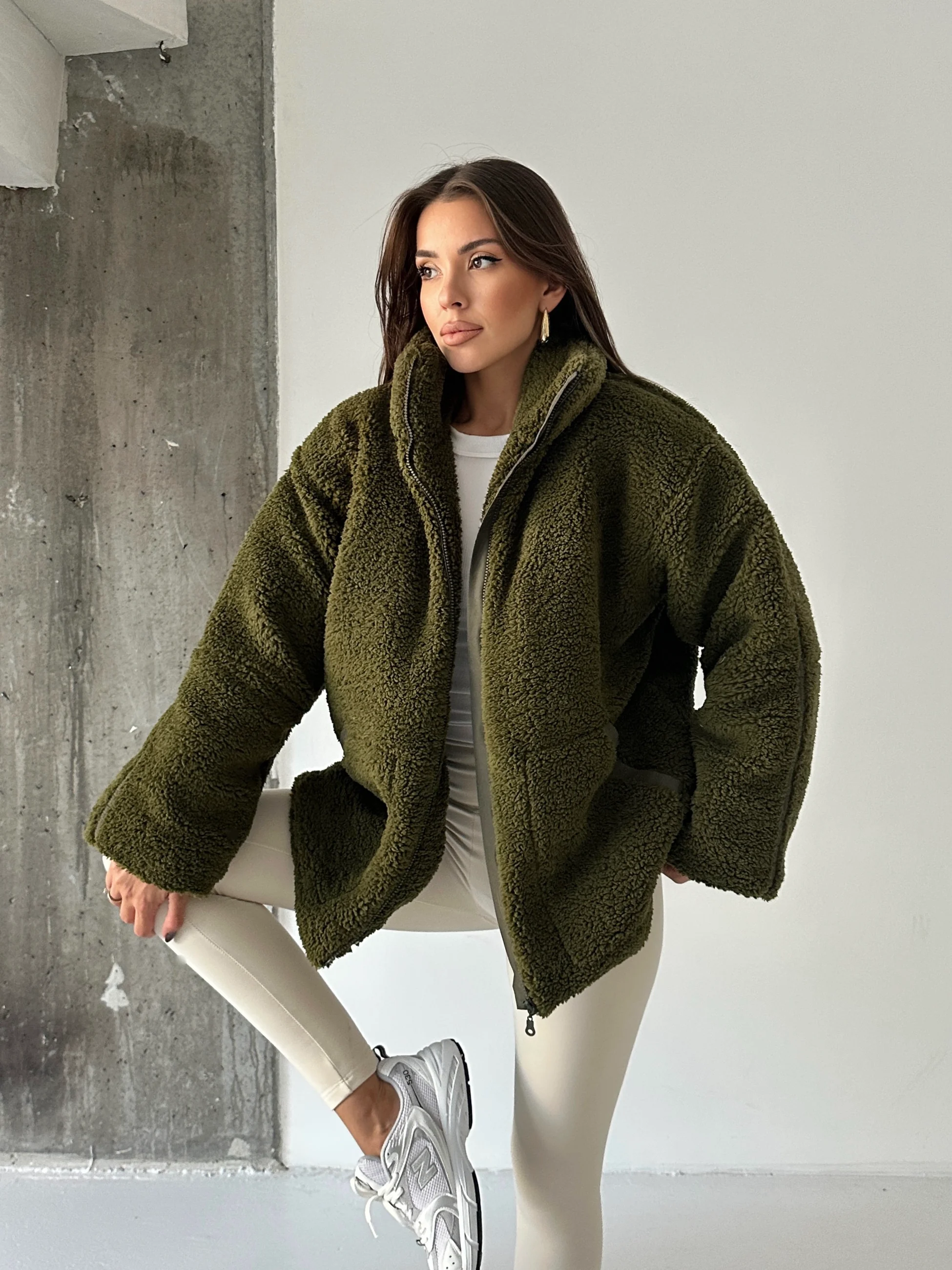 İç Astarlı Oversize Peluş Mont - Haki Yeşil (MYD7435_Haki Yeşil)