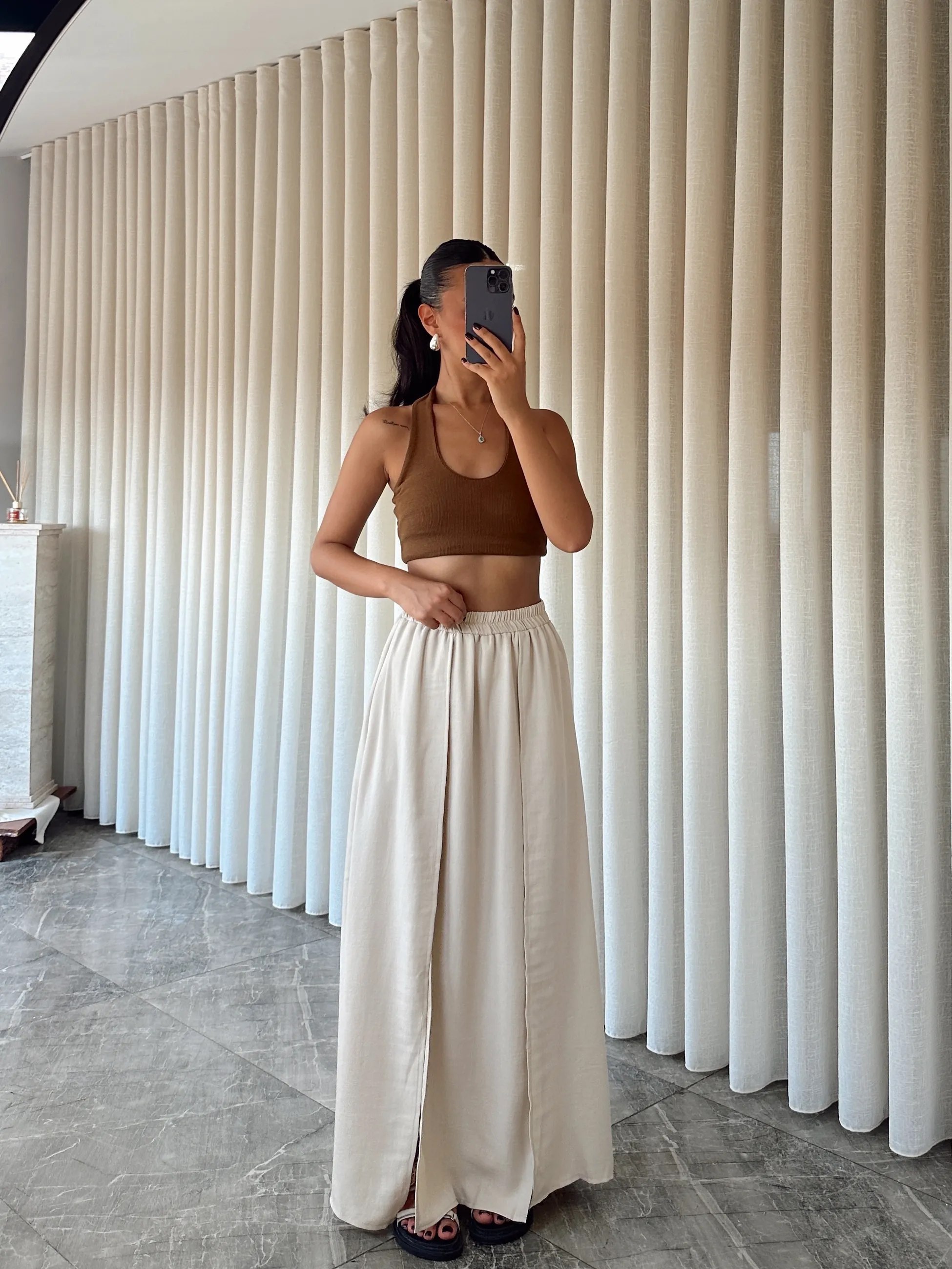 İçi Şortlu Derin Yırtmaç Maxi Etek - Bej (MD3924_Bej)
