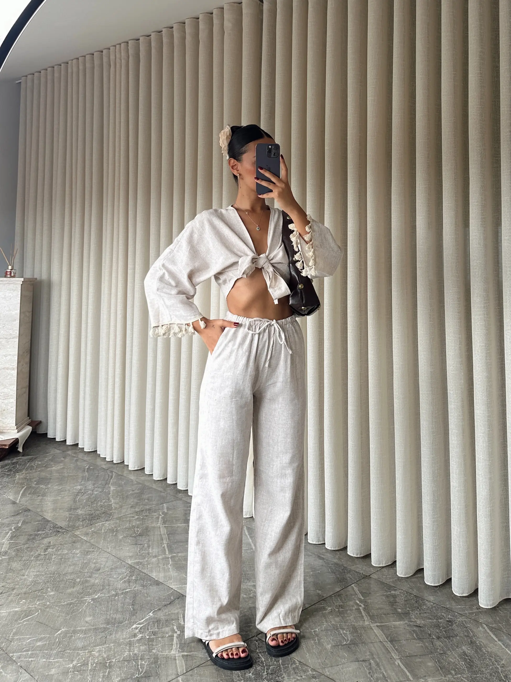 İnce Lastikli Keten Pantolon - Krem (MD3965_Krem)