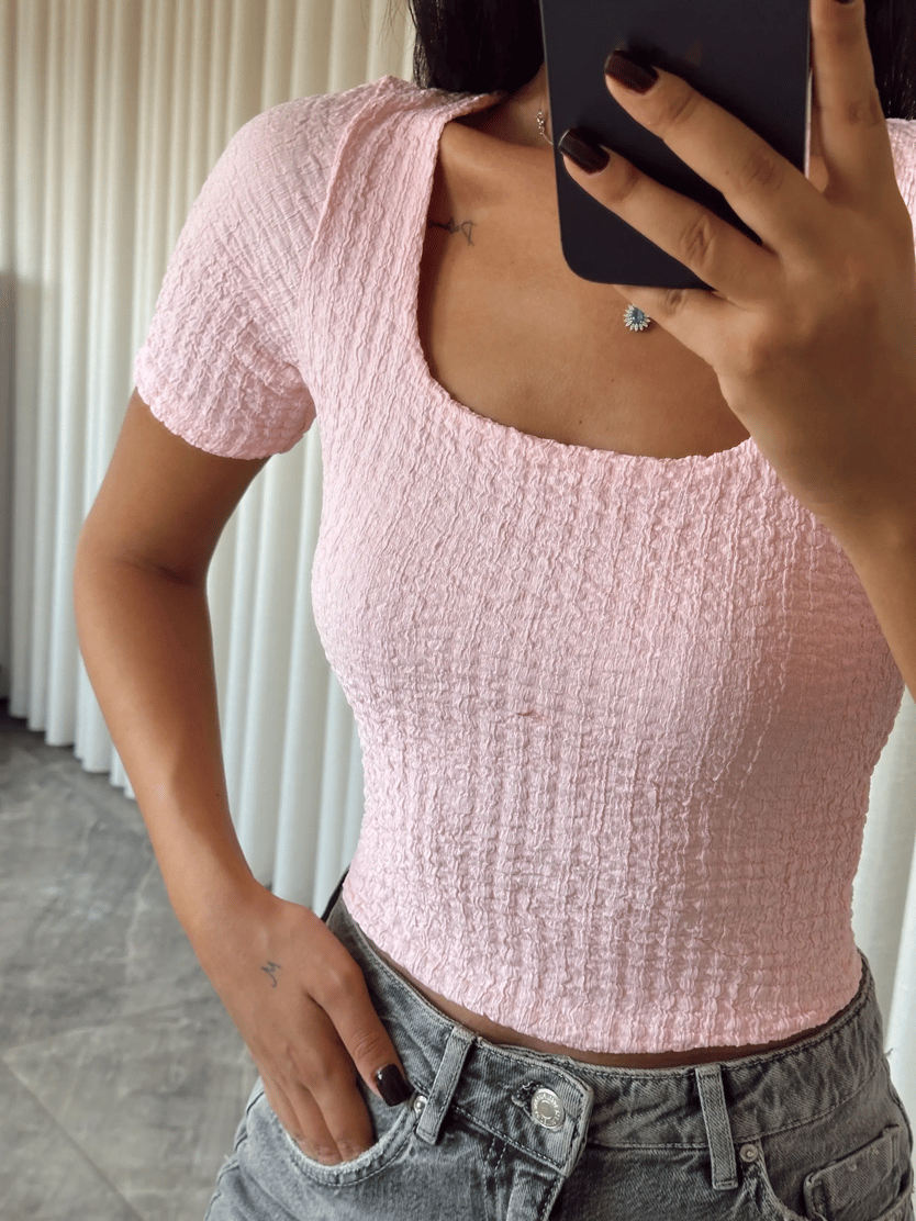 Kare Yaka Kabartmalı Crop - Pembe (MD3948_Pembe)