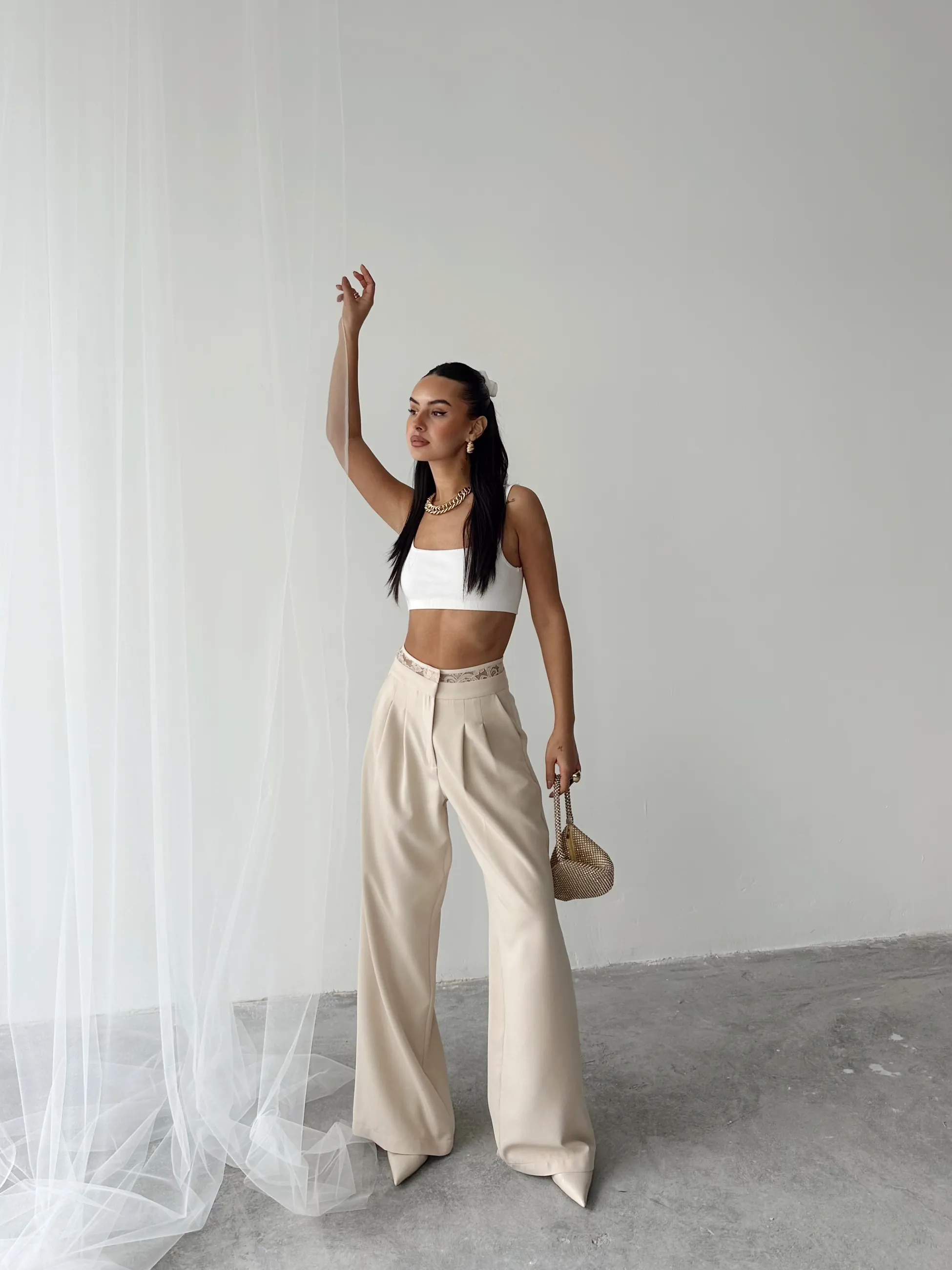 Kemeri Dantel Detaylı Palazzo Pantolon - Taş (MYD7453_Taş)