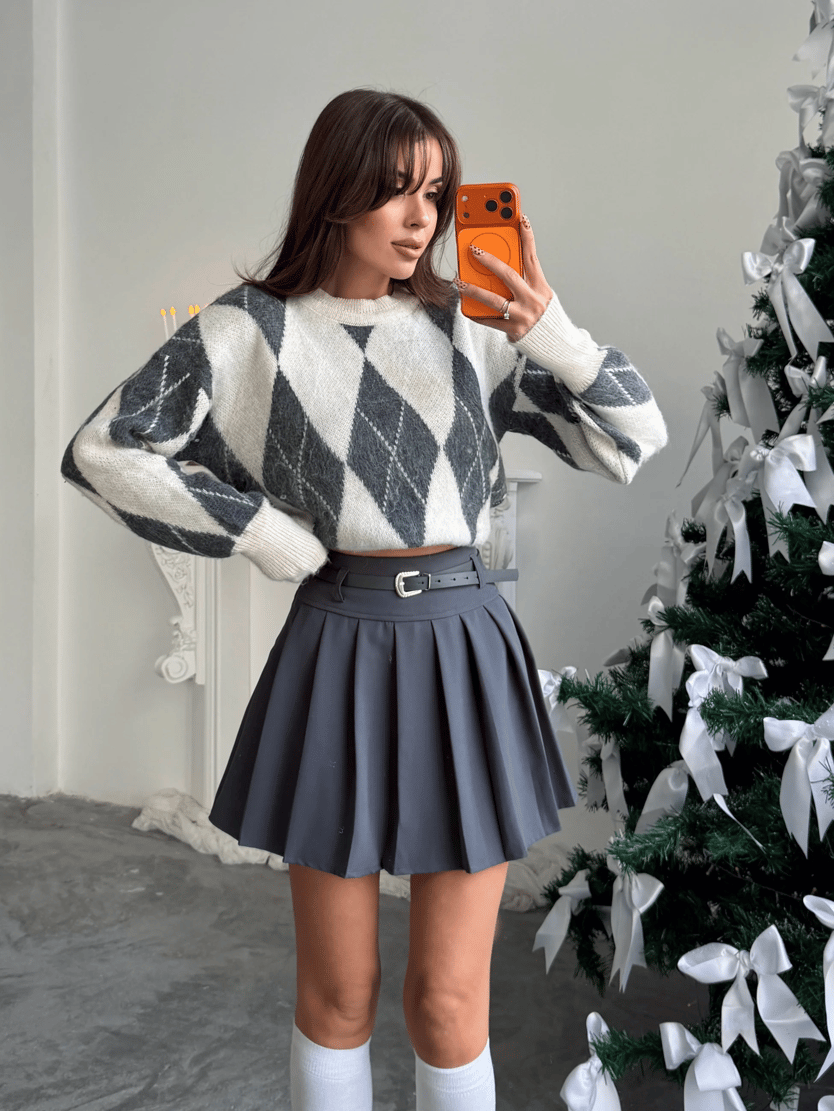 Kemerli Pileli Mini Etek - Füme (MD4176_Füme)