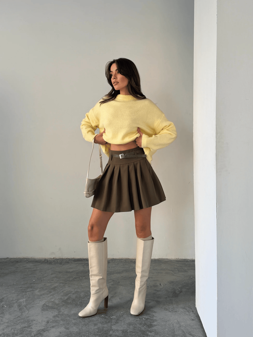 Kemerli Pileli Mini Etek - Haki Yeşil (MD4176_Haki Yeşil)