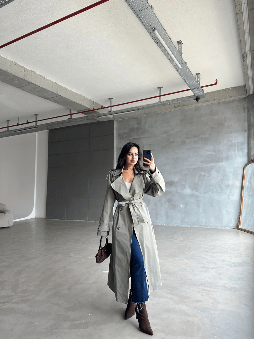 Şıklığı ve fonksiyonelliği buluşturan bu astarlı cep detaylı trençkot, kuşaklı tasarımıyla belinizi vurgular, modern ve zarif bir görünüm sağlar.