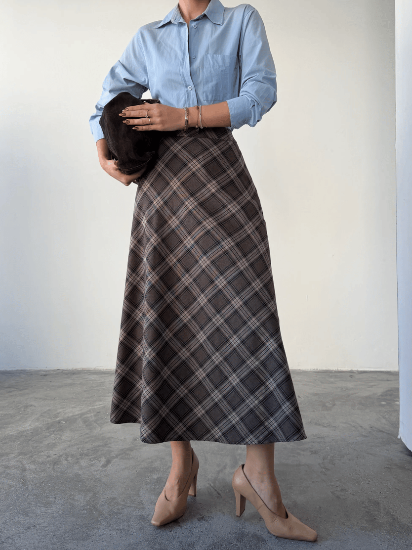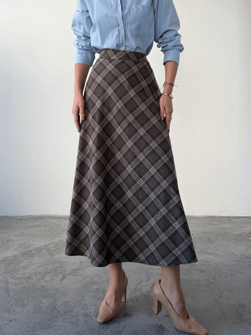 Kloş Ekoseli Etek - Kahve (MD4286_Kahve)