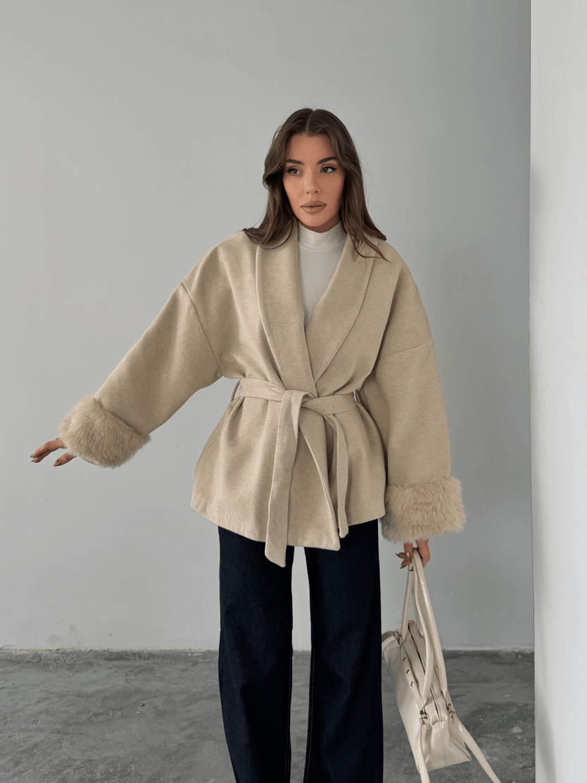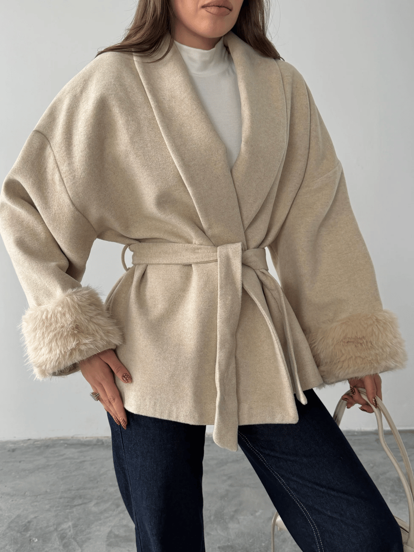 Kolları Kürklü Kuşaklı Kaşe Kaban - Taş (MD4272_Taş)
