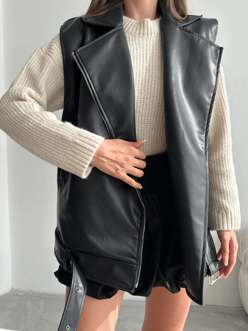 Kemerli oversize deri yelek, şıklığı ve modernliği bir araya getiren bir parça. Yüksek kaliteli deri kumaşı ile hem dayanıklı hem de stil sahibi bir görünüm sunar. Kemer detayı sayesinde belinizi vurgularken, oversize kesimi ile rahat bir kullanım sağlar.
