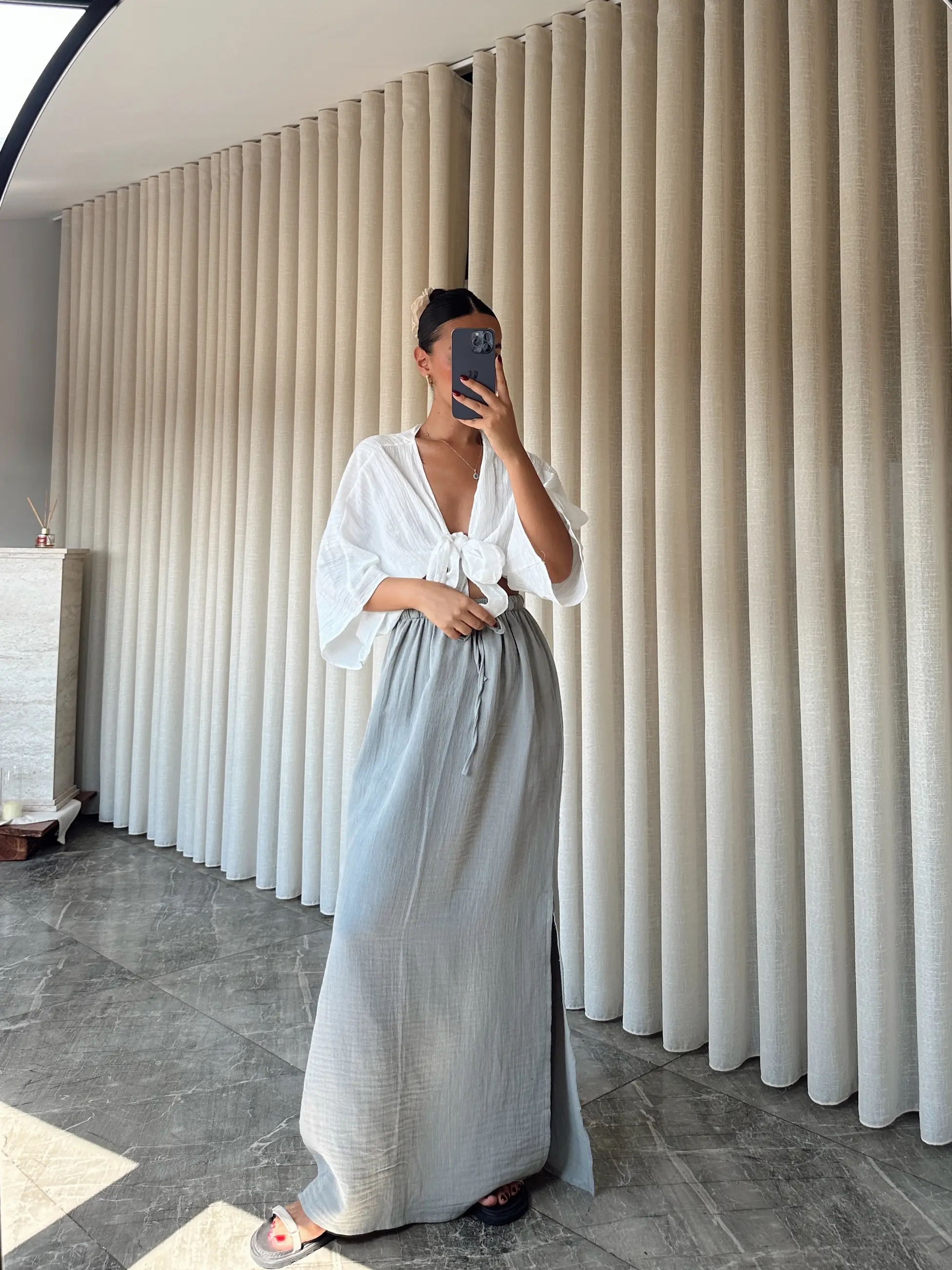 Müslin Yırtmaçlı Uzun Etek - Gri (MD3958_Gri)