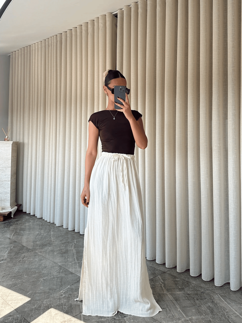 Müslin Yırtmaçlı Uzun Etek - Krem (MD3958_Krem)
