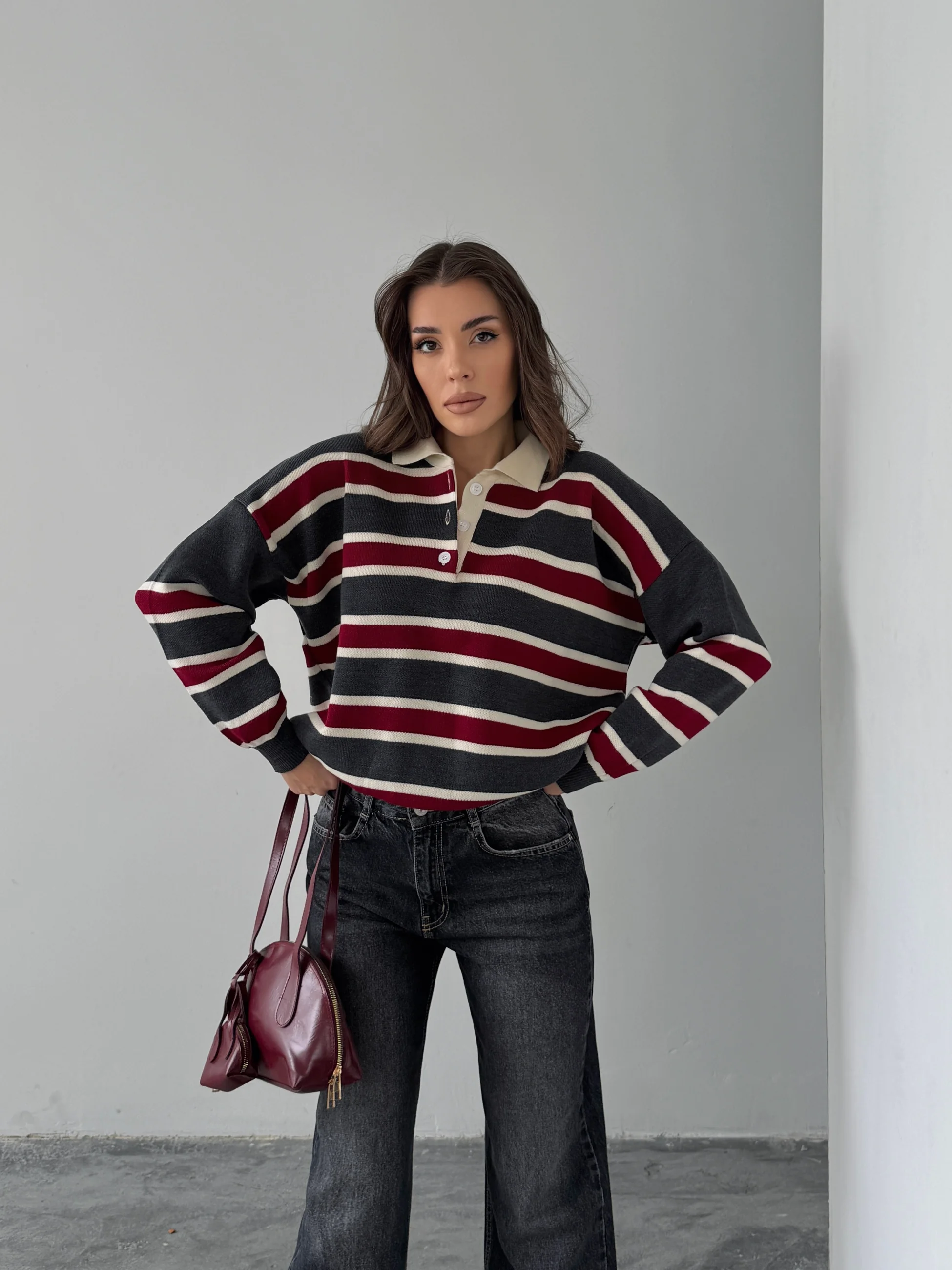 Polo Yaka Çizgili Triko - Bordo-Antrasit (MD4114_Bordo-Antrasit)