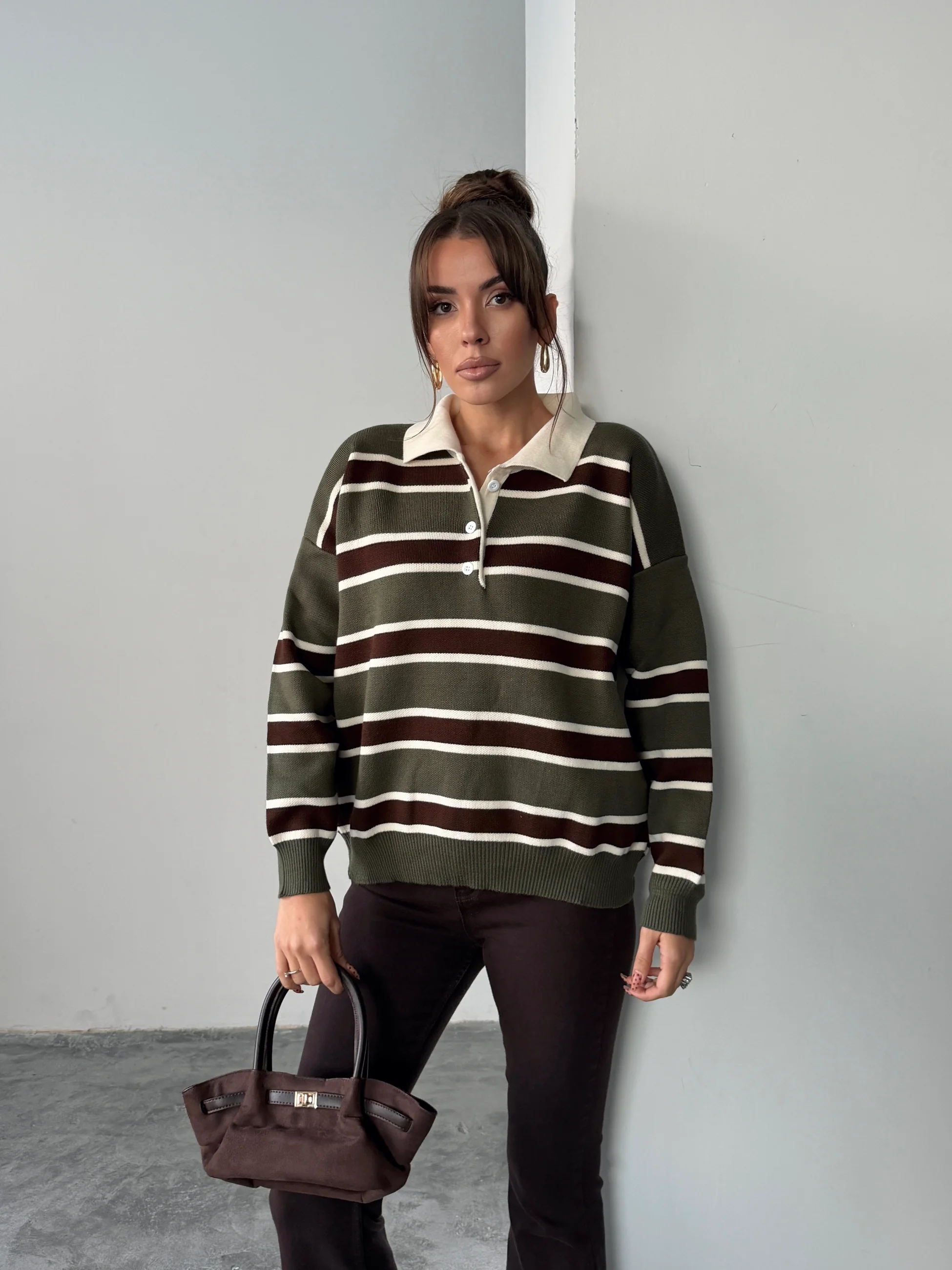 Polo Yaka Çizgili Triko - haki-kahve (MD4114_haki-kahve)