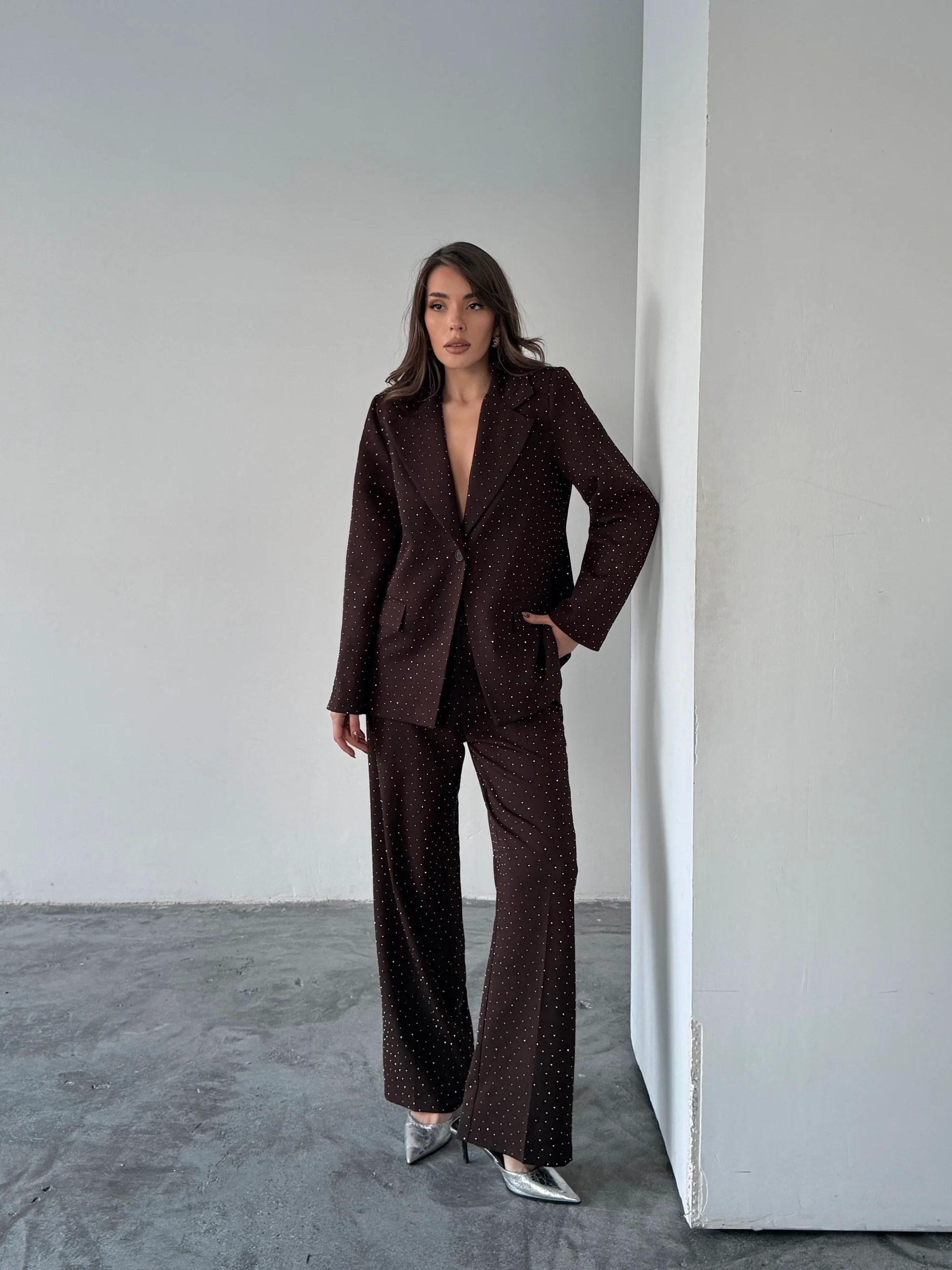 Premium Taş Detaylı Ceket Pantolon Takım - Kahve (MD4273_Kahve)