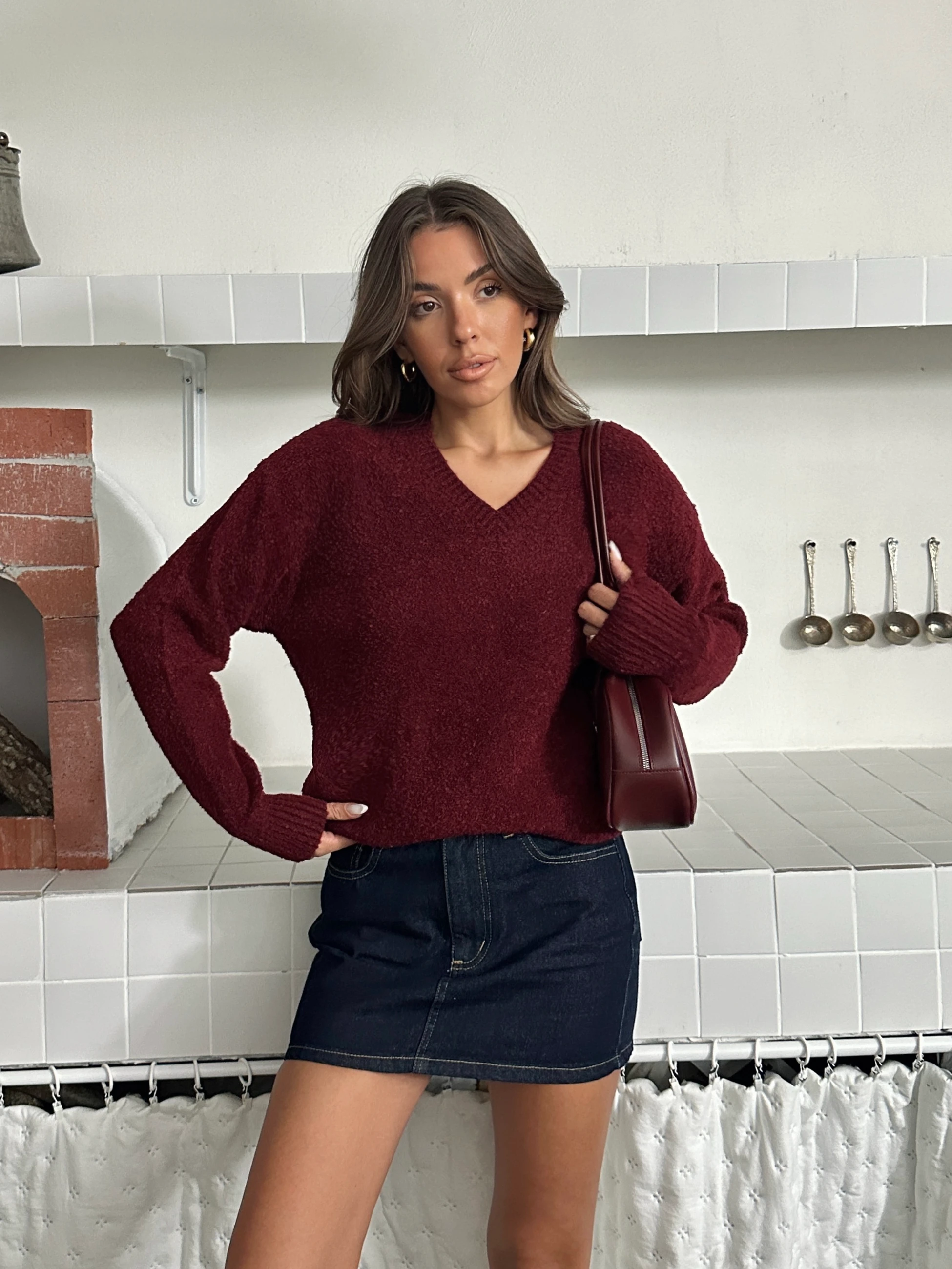 Şardonlu V Yaka Kazak - Bordo (MD4062_Bordo)