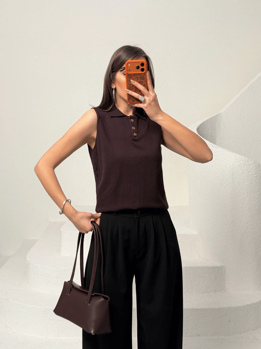 Sıfır Kol Yarım Düğme Triko Bluz - Kahve (MD4356_Kahve)