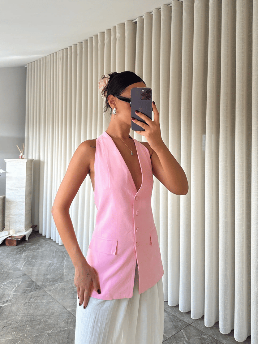 Sırt Dekolte Keten Yelek - Pembe (MD3954_Pembe)