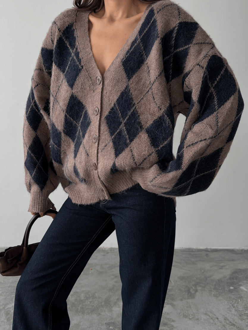V Yaka Baklava Desenli Düğmeli Hırka - Vizon (MD4269_Vizon)
