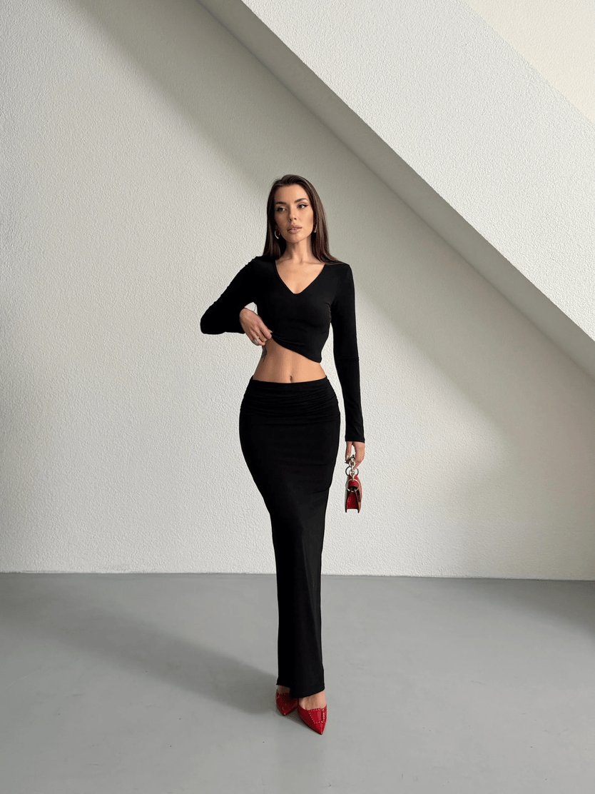 V Yaka Eteği Drapeli Takım - Siyah (MD4334_Siyah)