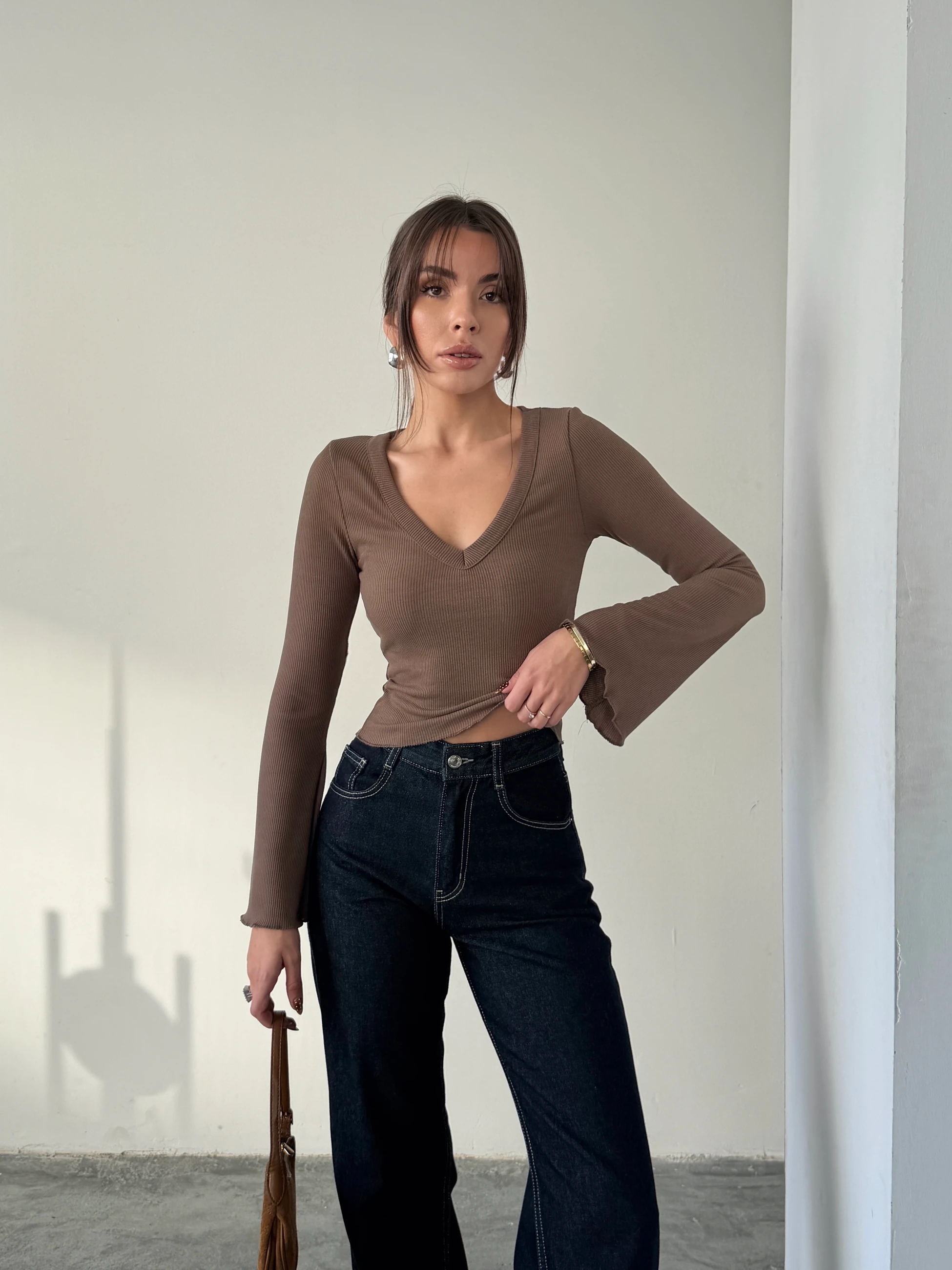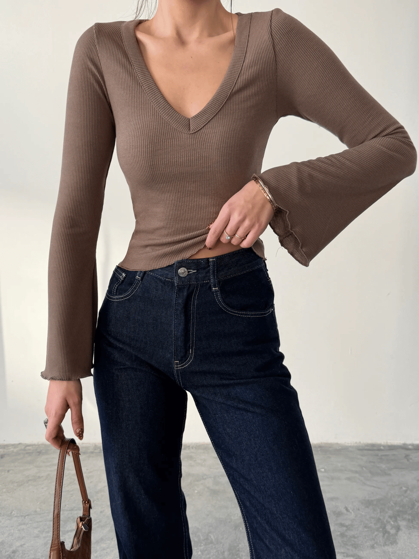 V Yaka İspanyol Kol Bluz - Kahve (MD4288_Kahve)