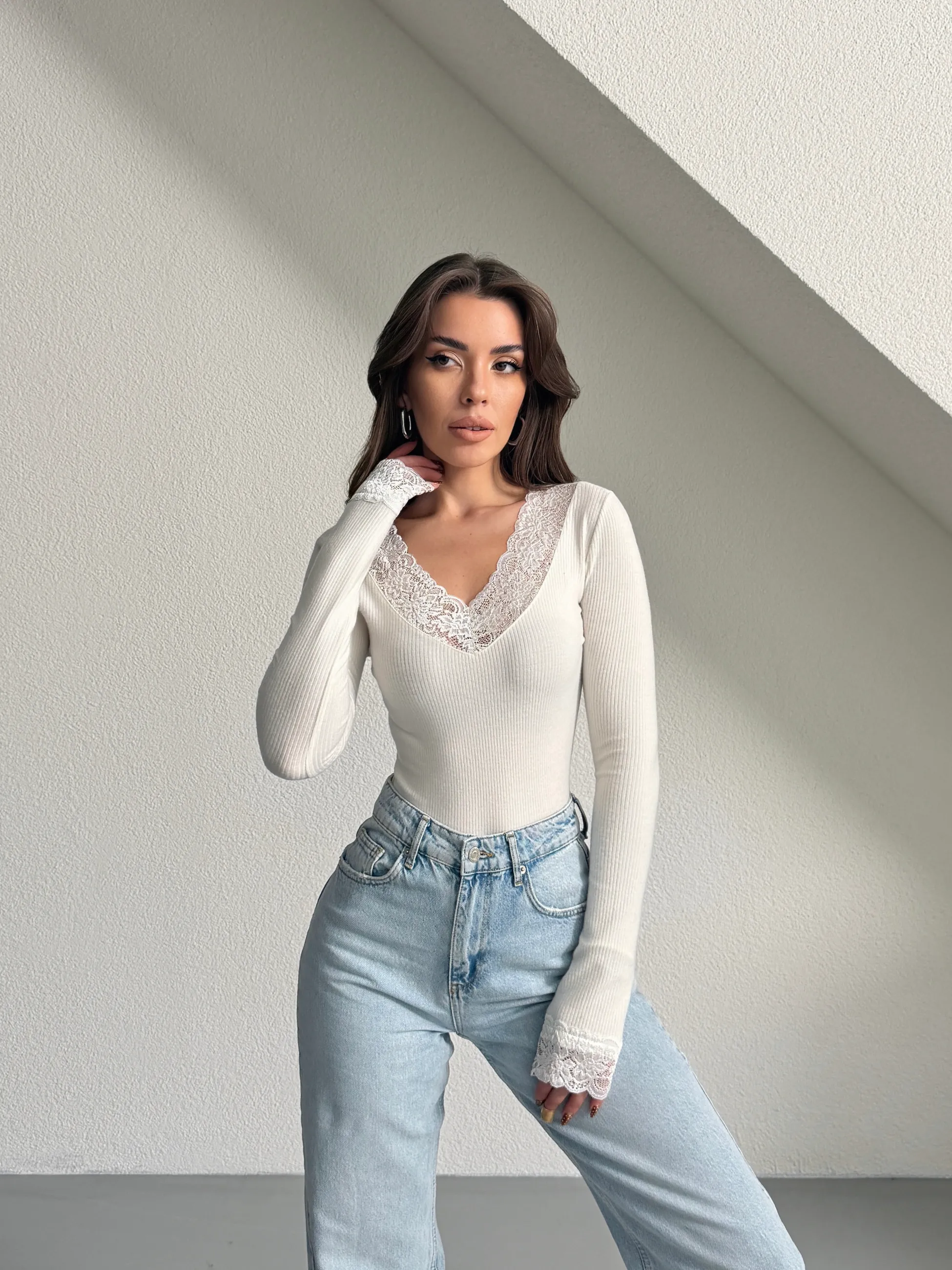 Yaka Ve Kol Dantel Bluz - Beyaz (MD4328_Beyaz)