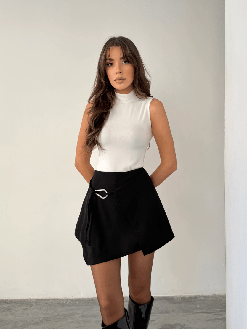 Yanı Tokalı Asimetrik Şort Etek - Siyah (MD4218_Siyah)